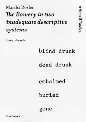 The first sustained critical examination of a work by Martha Rosler that bridged the concerns of conceptual art with those of political documentary. In The Bowery in two inadequate descriptive systems (1974--1975) Martha Rosler bridged the concerns of conceptual art with those of political documentary. The work, a series of twenty-one black-and-white photographs, twenty-four text panels and three blank panels, embraces the codes of the photo-text experiments of the late 1960s and applies them to the social reality of New York's Lower East Side. The prevailing critical view of The Bowery focuses on its implicit rejection, or critique, of established modes of documentary. In this illustrated, extended essay on the work by Rosler, Steve Edwards argues that although the critical attitude towards documentary is an important dimension of the piece, it does not exhaust the meaning of the project. Edwards situates the work in relation to debates and practices of the period, especially conceptual art and the emergence of the photo-text paradigm exemplified by the work of Robert Smithson, Bernd and Hilla Becher, Hans Haacke, Victor Burgin, and the Women and Work group. In particular, he contextualizes Rosler's work of this period within the politicized San Diego group (which included, in addition to Rosler, Allan Sekula, Fred Lonidier, and Philip Steinmetz). Comparing The Bowery to Rosler's later video vital statistics of a citizen , simply obtained (1977) and the films of the Dziga-Vertov Group (formed by Jean-Luc Godard and Jean-Pierre Gorin), Edwards shows how the work engages with conceptual art and the neo-avant-garde of the 1960s and 1970s.
