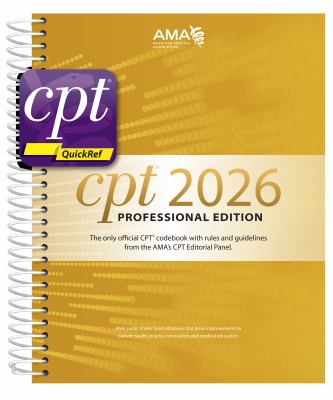 FEATURES AND BENEFITS For features and benefits of the printed codebook included in this package, please see the CPT(R) 2026 Professional Edition product announcement. Features of the CPT QuickRef app with premium content include: Updated E/M Wizard New 2026 guidelines for coding E/M services using either time or medical decision making (MDM) The latest information -- Receive updates from the cloud when new RVUs and proprietary laboratory analysis (PLA) codes are released or when technical corrections are made to 2026 CPT codes Favorites -- Select the codes you use most and save them to your favorites list Facility and non-facility RVUs -- Use federal data on facility and non-facility work and practice expense values GPCIs -- Set your region's geographic practice cost index to calculate accurate Medicare payment for each procedure Global days -- Reference the number of global days CMS assigns to a given procedure Color illustrations -- Better understand complex procedures with AMA-created illustrations Clear references to CPT(R) Assistant articles -- Quick view of article titles and year of publication Improved search -- Enter the first three or more digits of a CPT code to get suggested matches Past years' codes -- Upgrade to the multiyear option to access codes from 2019-2026 for audits and references.