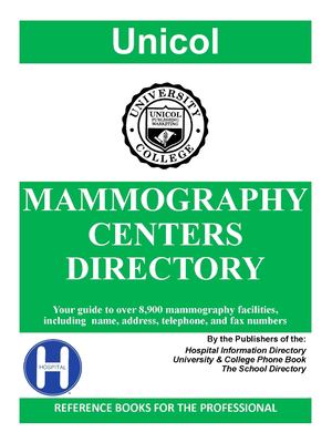 Mammography Centers Directory: a guide to 8,900+ mammography facilities, including name, address, phone & fax numbers. Directory is divided into 2 sections: geographical & alphabetical. Geographical main section: mammography centers arranged by state & city. Alphabetical index: when only mammography center name is known & not exact location.